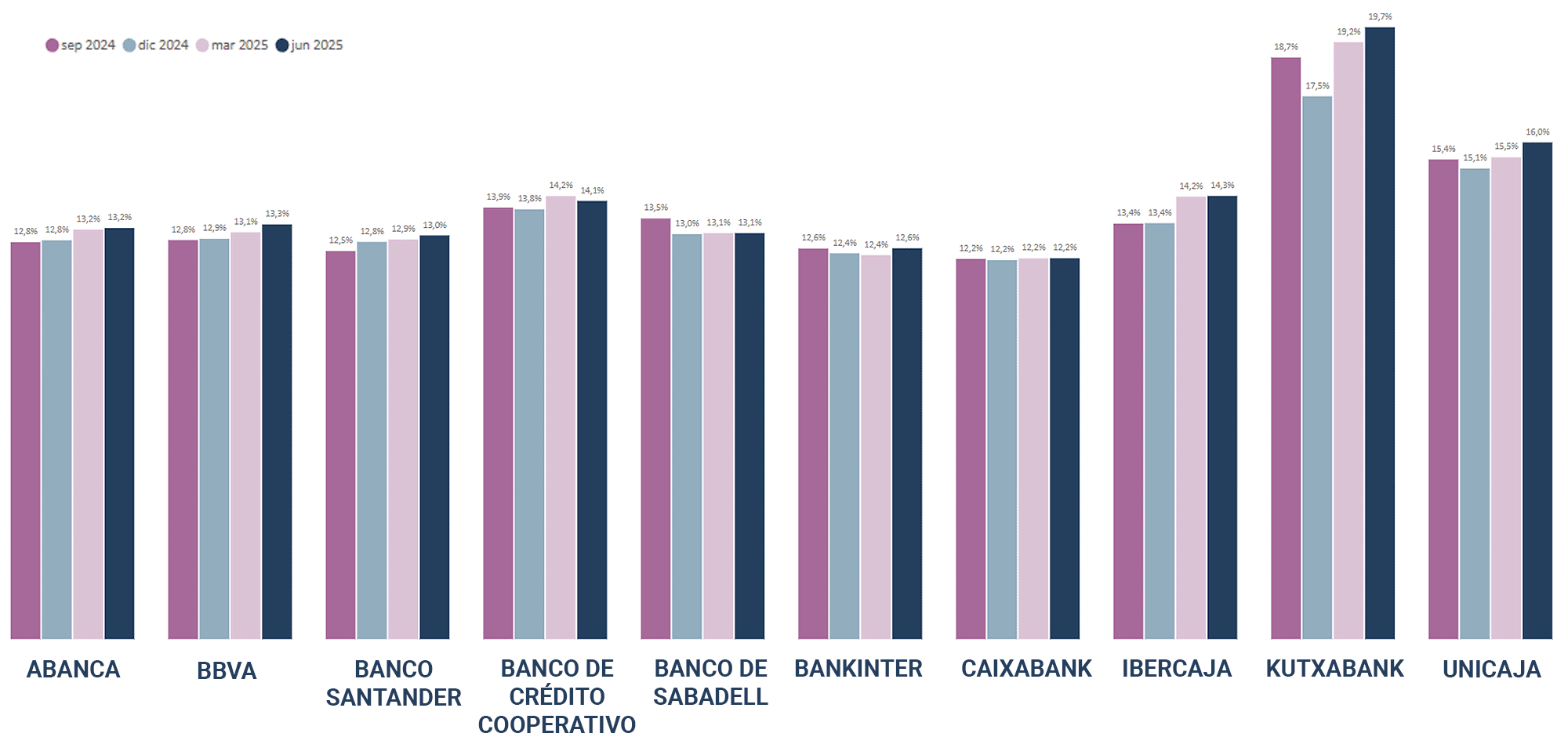 Datos del Ejercicio de Transparencia de la Autoridad Bancaria Europea (EBA), publicados en diciembre de 2025, con los datos de septiembre 2024, diciembre 2024, marzo 2025 y junio 2025.